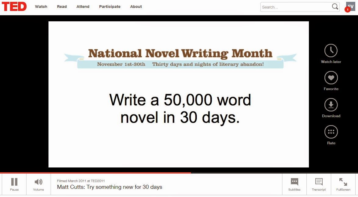 "I also figured out that if you really want something badly enough, you can do anything for 30 days. Have you ever wanted to write a novel? Every November, tens of thousands of people try to write their own 50,000-word novel from scratch in 30 days. It turns out, all you have to do is write 1,667 words a day for a month. So I did. By the way, the secret is not to go to sleep until you've written your words for the day. "