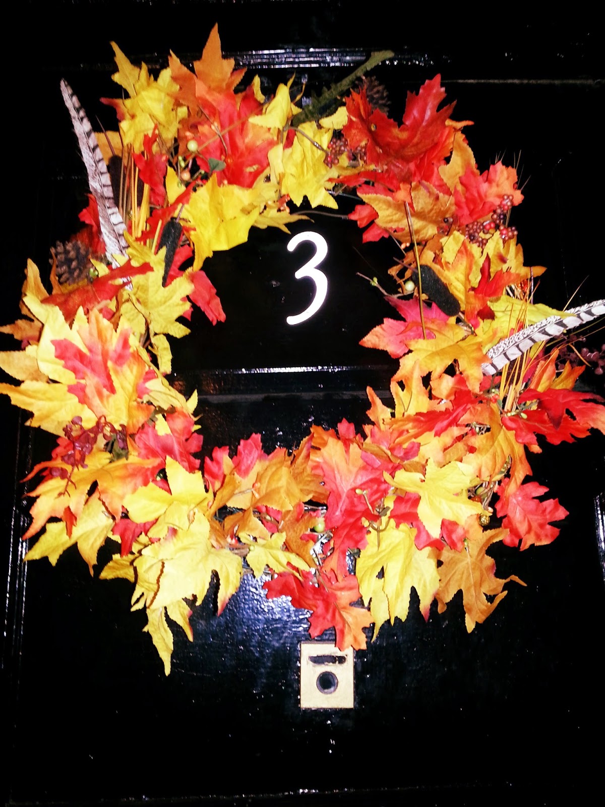 In early September I saw the fall decor bandwagon pull up, and I jumped on. Wal-mart happened to have all the necessities for a cheap fall wreath, and so I grabbed a bunch of leaves and a wire wreath frame I'll be able to repurpose for upcoming seasons.